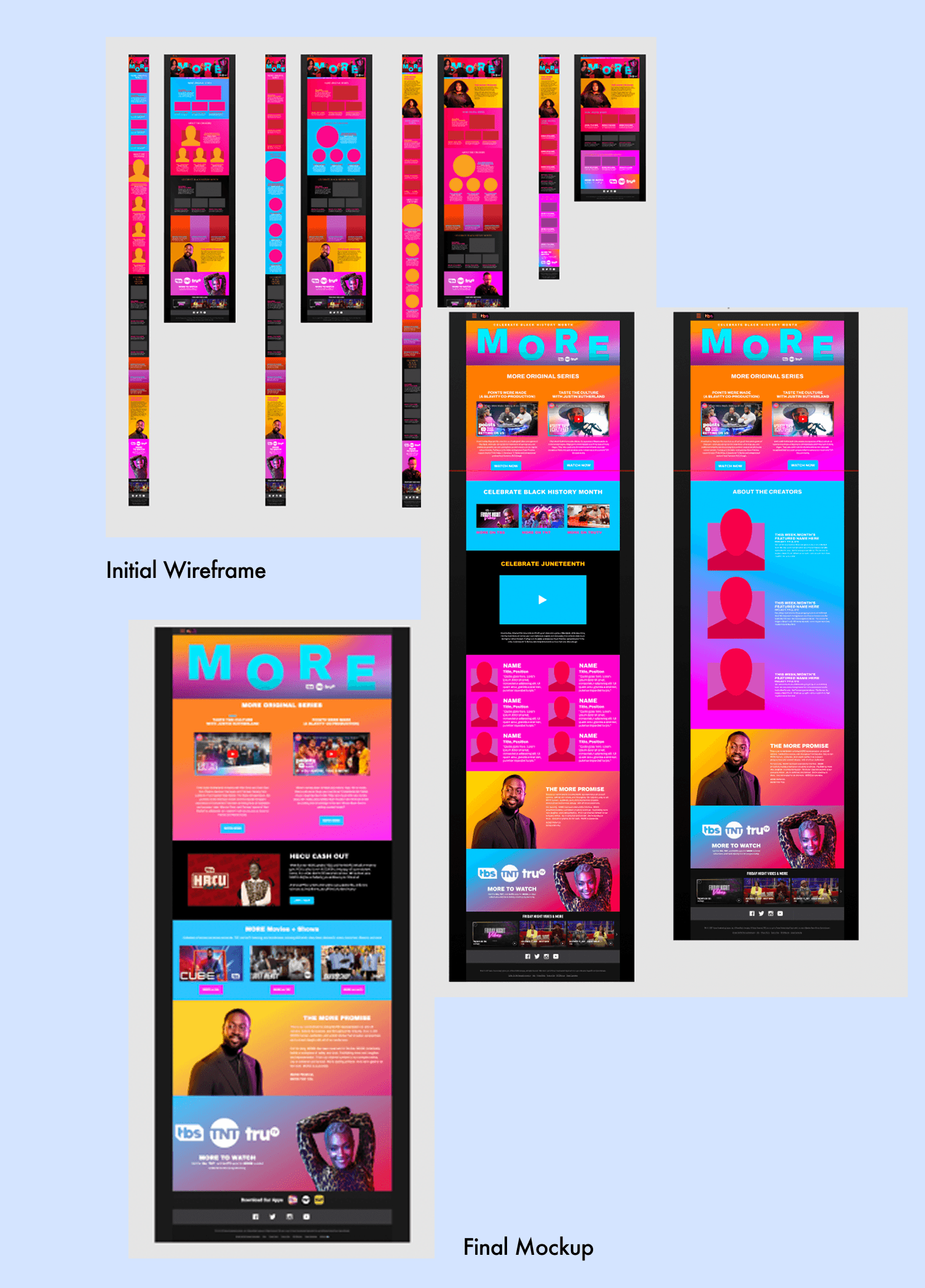This microsite was designed while working at Warner Media for TBS/TNT/truTV for the MORE Initiative. It is a continuously updated site where it serves as a hub for resource videos and information on the initiative. I worked on the wire framing using Figma and the coding of the final site. You can find the live site here.